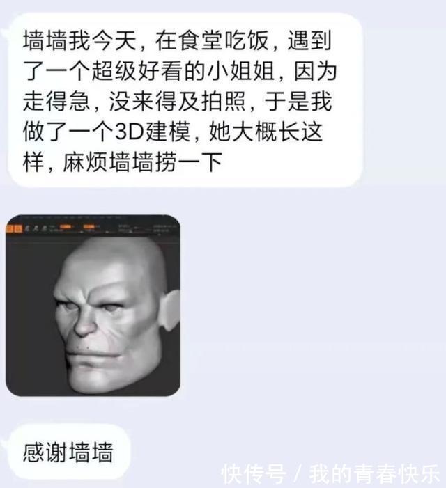 这位大学生在食堂里吃饭的时候,遇到了非常好看的小姐姐,由于走的太着急了,所以没来得及拍照,于是他就做了一个3D建模,表示想要找一下这位小姐姐,不过在这里笔者要说一下,该同学追求爱情的心可以理解,不过这个建模做的是个啥,如此模样,实在是让人感到好笑,相信即便是有长得如此模样的女生也不敢出来说话吧。